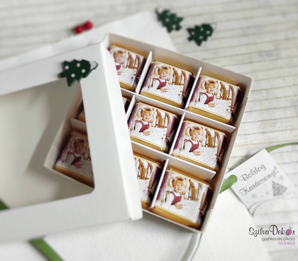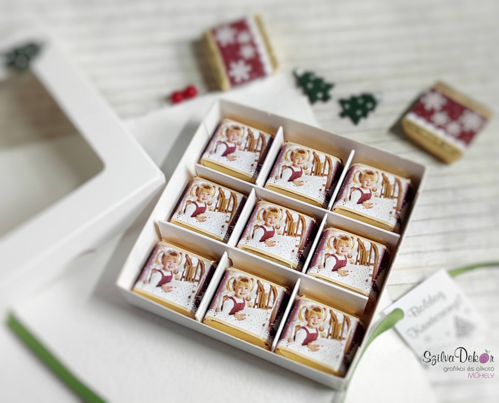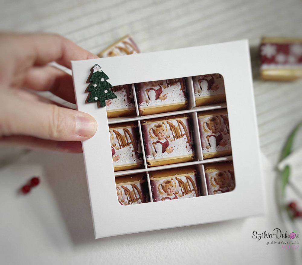 Bármelyik karácsonyi mintás csokipapírt kérheted a dobozokba, csak ki kell választanod, melyik tetszene legjobban az elkészített alapok közül. Ebbe az alapba helyezzük el az általad küldött fotókat.