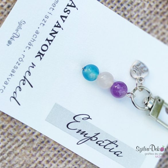 Ezek a kézzel készített kulcstartók 8 mm átmérőjű ásványgyöngyök felhasználásával készültek.